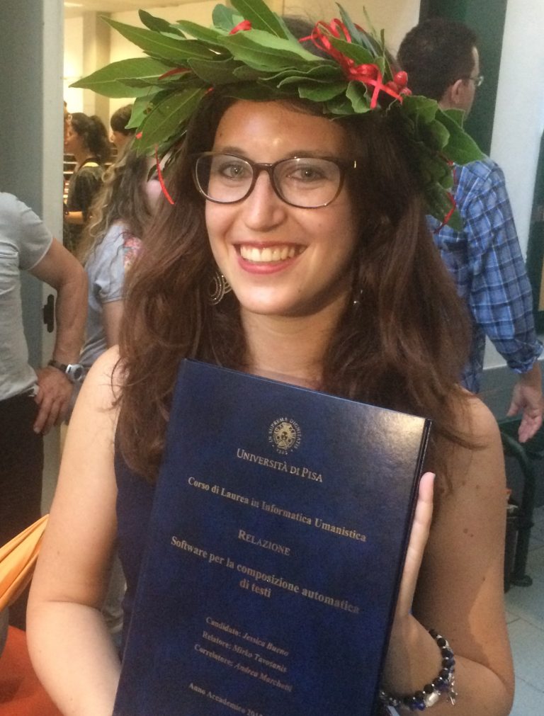 Il 7 luglio 2016 si è laureata all’università di Pisa la dottoressa Jessica Bueno in Informatica Umanistica discutendo la tesi “Software per la composizione automatica di testi”, con votazione 99/110. Congratulazioni vivissime da parenti e amici.