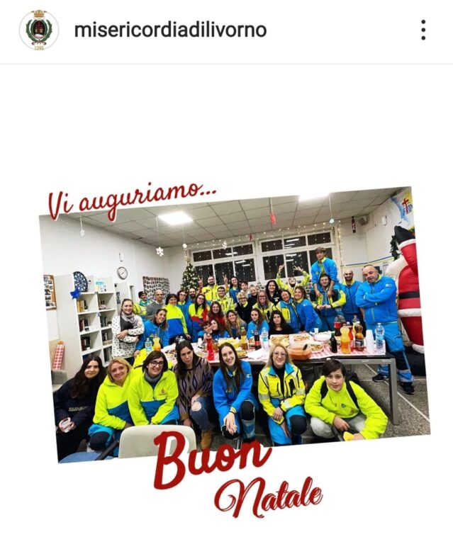 Un bellissimo augurio anche dalla sede di via Verdi della Misericordia di Livorno dove tutti i volontari hanno posato davanti all’albero di Natale con una bella grafica che, scritta in rosso, recita: “Buon Natale”.