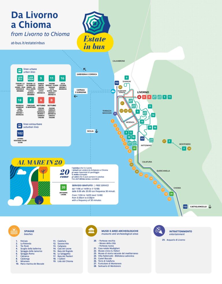 Dalla fermata/capolinea in via Pigafetta ad Antignano, tutte le domeniche dall'11 giugno al 14 settembre ferragosto compreso, ogni 30 minuti partirà un autobus che fermerà in 10 spiagge dal Parco Marina del Boccale al Lido del Chioma. Salvetti: "Grazie a Comune, AT e Aamps il progetto dei giovani studenti della Commissione Ambiente e Mobilità è diventato realtà". "20" come il numero dell'autobus e il nome sulla app at-bus e... non solo