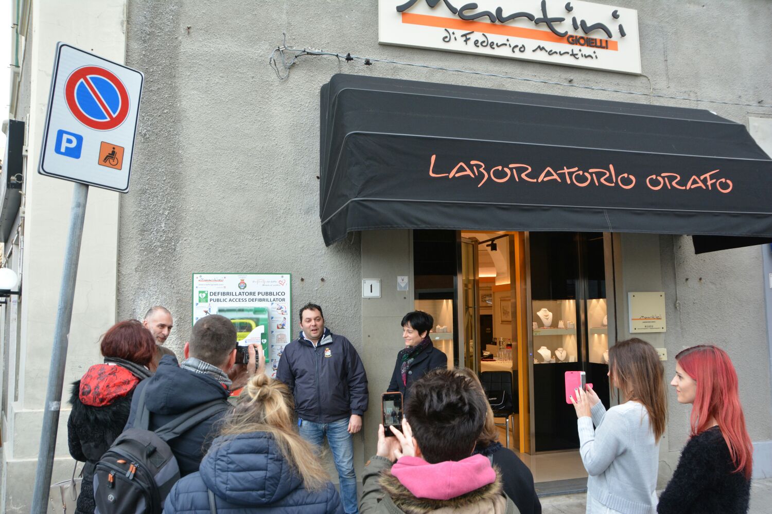 Il primo defibrillatore pubblico, in città, è stato ufficialmente collocato a fianco della gioielleria Martini, in Borgo Cappuccini 1, nei pressi di piazza Giovine Italia, con la collaborazione del Comune di Livorno (foto Simone Lanari).