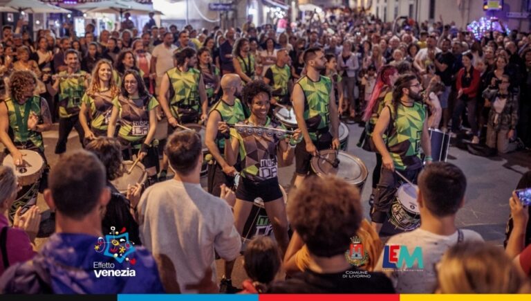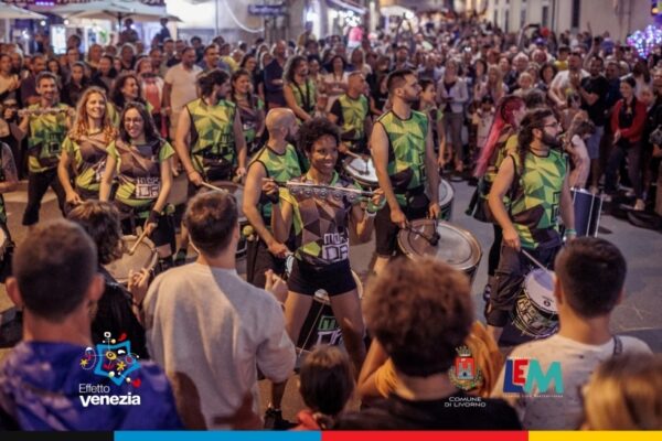 I Moruga Drum a Effetto Venezia 2023 (foto tratta dalla pagina Fb Visit Livorno) e il sindaco Salvetti durante la conferenza stampa del 24 ottobre 2023