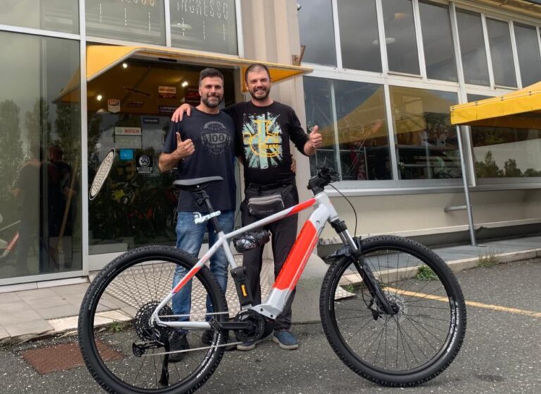 Francesco Stefanini, a destra, insieme al titolare di Bike Store Emilio Camici durante la consegna della nuova bicicletta e la pulizia effettuata il 1 novembre in via Boccherini