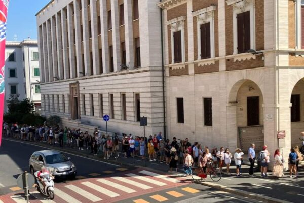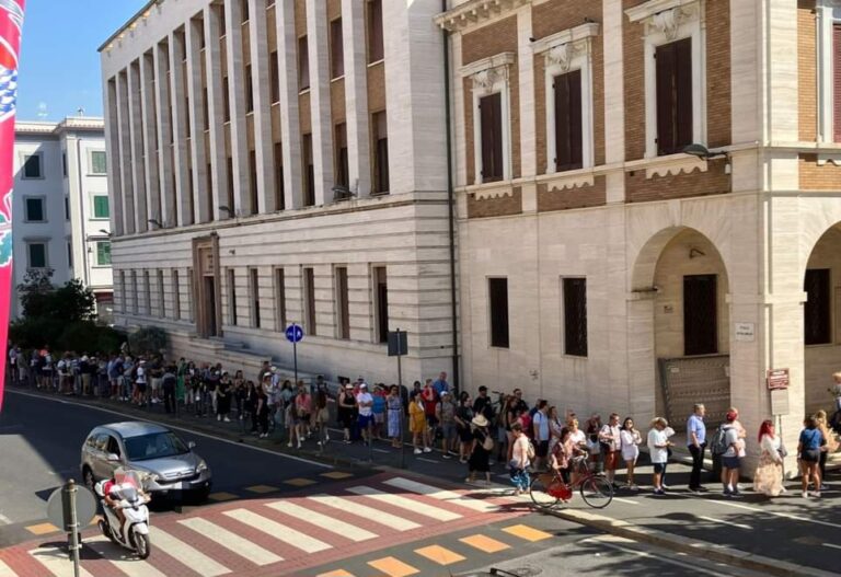 Duecento metri di fila e forse di più (dalla foto gentilmente concessa dall’assessore al commercio Rocco Garufo e pubblicata dallo stesso Garufo sulla propria pagina Fb non si riesce a vedere la fine). Ipotizzando inizi all’altezza di via della Madonna, come nella foto, con l’aiuto di Google Maps “scopriamo” che sono stati appunto duecento i metri di turisti in coda fino all’Ufficio Turistico di Livorno in via Cogorano. “Abbiamo accolto e dato informazioni – spiega la responsabile dell’area turismo e cultura del consorzio Coeso, il soggetto che gestisce l’ufficio di informazione turistica Anna Marchi – a 1.600 turisti nella sola giornata del 27 settembre, di provenienza eterogenea a seguito dell’arrivo di tre navi, tra cui una nave Norvwgean Epic che ripartiva alle ore 15 e quindi la maggior parte dei turisti è rimasta a Livorno e poi si è messa in coda per salire sugli Shuttle Bus e risalire sulla nave. Abbiamo gestito il tutto fornendo le informazioni necessarie a tutti. Inoltre abbiamo attivato oltre 100 pacchetti tra walking tour, tour in battello e city sightseeing”. Una coda che ha sorpreso persino l’assessore: “Ho visto una fila incredibile di turisti. Erano tutti croceristi che dopo aver passato la mattina a Livorno attendevano lo shuttle bus per rientrare in nave. Livorno è una città turistica”.