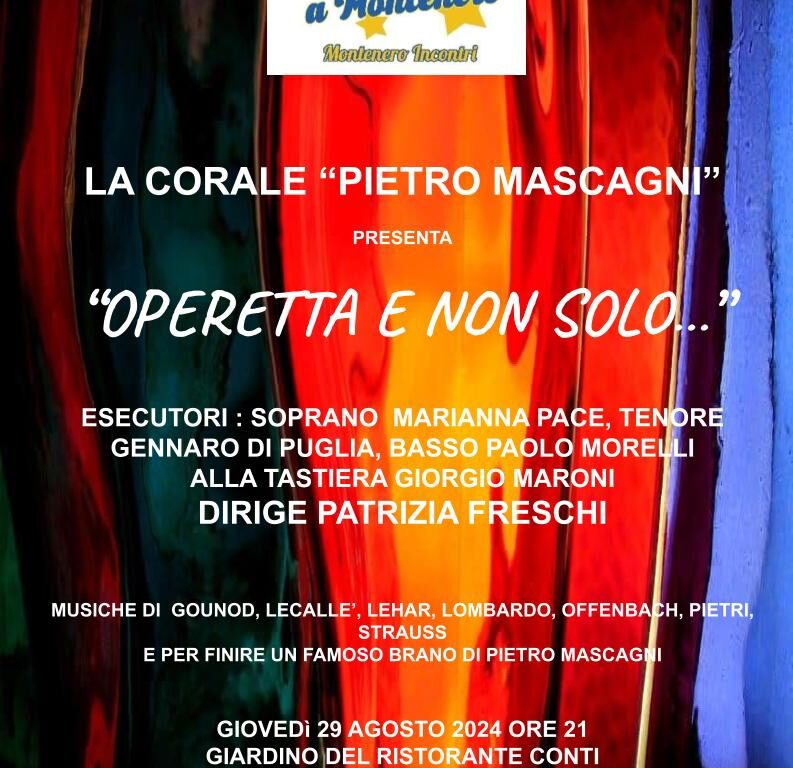 La lunga serie della Manifestazione “Tocca le stelle a Montenero” 2024, si arricchisce di una nuova offerta musicale, infatti giovedì 29 agosto, nel giardino del Ristorante Conti, con inizio alle ore 21, la Corale “P. Mascagni” presenterà un ricco programma di musica briosa ed accattivante dal titolo “Operetta e non solo…”... Continua a leggere