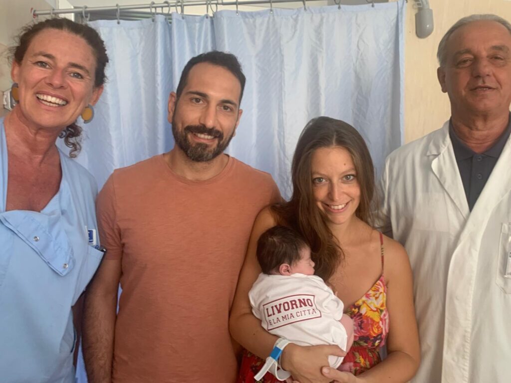 Erika e Mauro con la figlia Nina durante la consegna stamattina, da parte della responsabile delle ostetriche Marzia Chellini e del primario di Pediatria Roberto Danieli, della prima maglietta "Livorno è la mia città" di Appartenenza Labronica... Continua a leggere