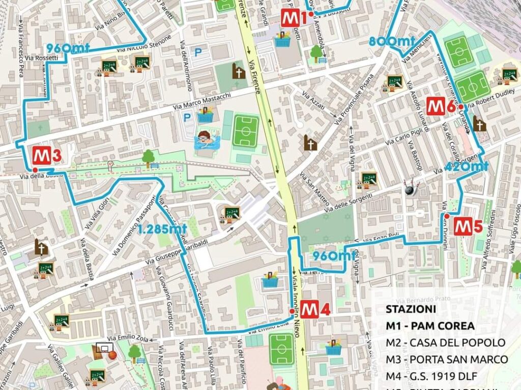 È un percorso urbano caratterizzato da 7 “stazioni” di partenza, salita, discesa e arrivo, la cui distanza e i cui orari consentono ai singoli, o a gruppi di persone, di salire su “convogli pedonali” formati da gruppi di persone omogenee ... Continua a leggere