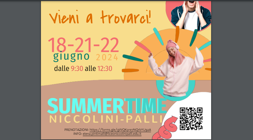 In occasione del Summertime 2024, il liceo Niccolini-Palli apre le porte agli studenti e alle studentesse delle scuole secondarie di primo grado nei giorni di martedì 18, venerdì 21 e sabato 22 giugno, dalle 9,30 alle 12,30... Continua a leggere