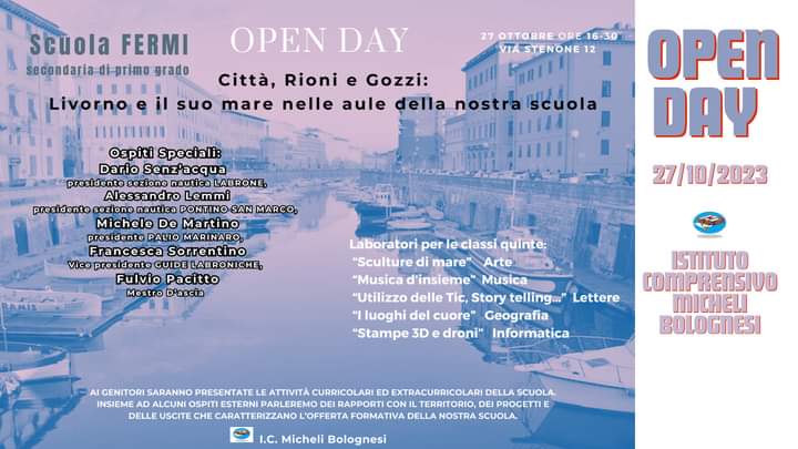 Venerdì 27 ottobre dalle 16.30 alle 19 la scuola secondaria di primo grado Fermi dell’Istituto Comprensivo Micheli-Bolognesi si presenta ai futuri alunni con un Open Day dal titolo “Città, rioni e gozzi: Livorno e il suo mare nelle aule della nostra scuola”... Continua a leggere