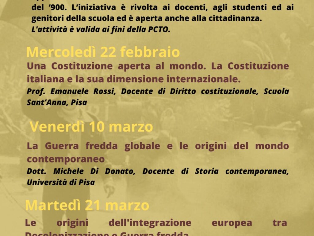 Mercoledì 22 febbraio, alle 15, all'interno dell’aula magna del Liceo Cecioni, prende il via il ciclo di conferenze sulla storia del secondo Novecento organizzato dal Dipartimento di Filosofia, Storia e Scienze umane della scuola... Continua a leggere