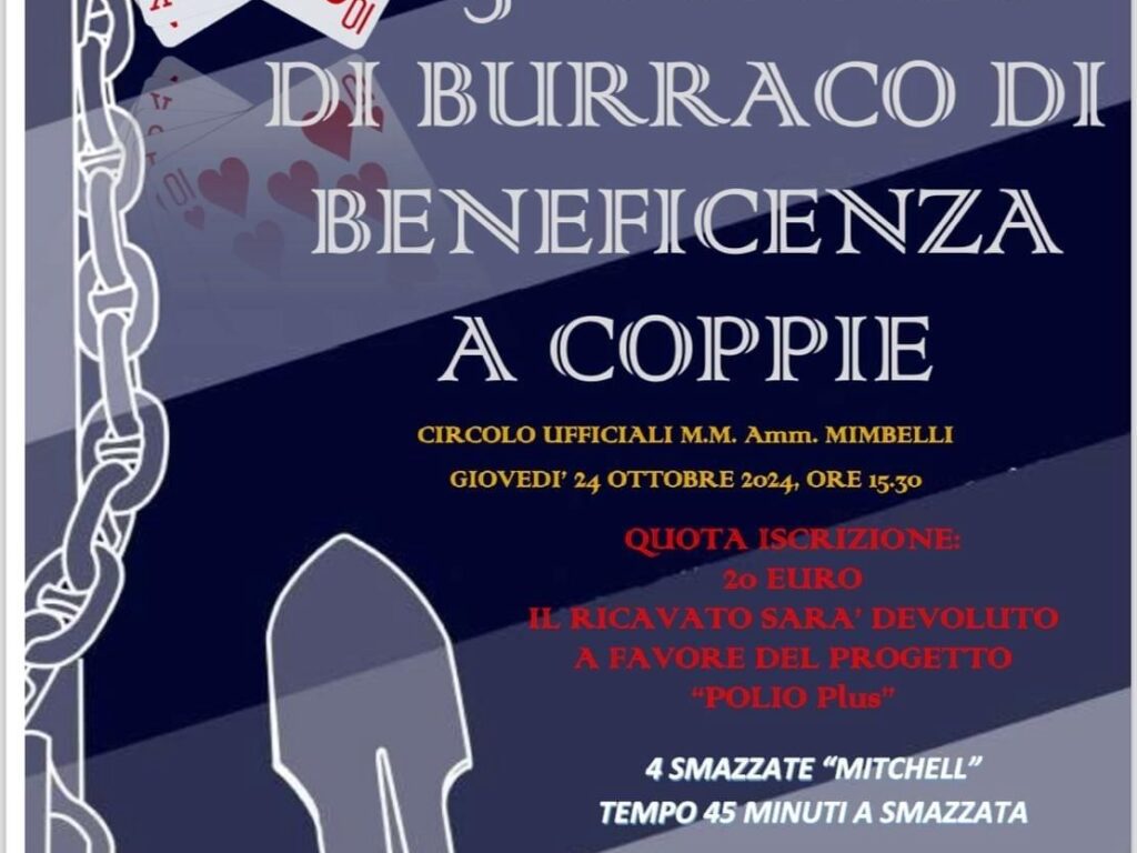In occasione della Giornata Mondiale per la lotta contro la Poliomelite, il 24 ottobre alle ore 15.30 al Circolo Ufficiali M.M Amm. Mimbelli è in programma il 3° torneo di burraco a coppie per raccogliere fondi e contribuire a eradicare la polio nel mondo... Continua a leggere