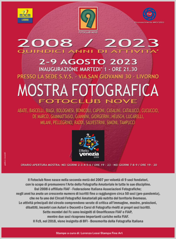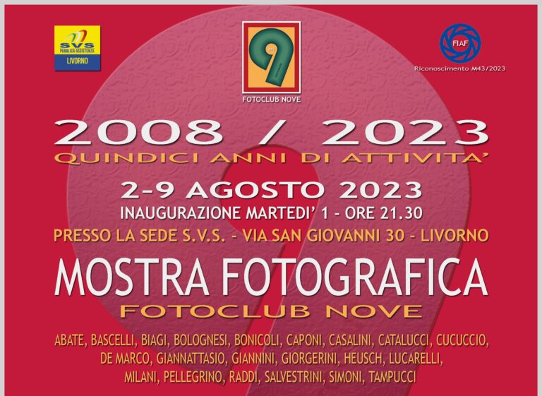 Si inaugura martedì 1 agosto alle 21.30, nei locali Svs di via San Giovanni a Livorno, la mostra fotografica  “15 anni del Fotoclub Nove Livorno” a cura del Fotoclub Nove Livorno.