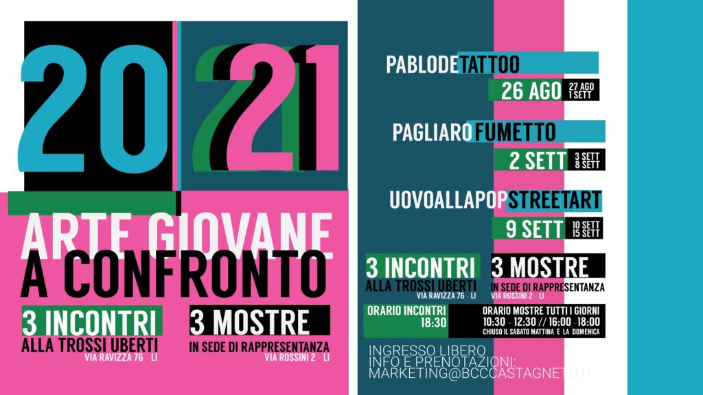 La Banca di Credito Cooperativo di Castagneto Carducci, è lieta di presentare al pubblico il progetto 20 21 Arte Giovane a Confronto, articolato in tre incontri alla Villa Trossi Uberti e tre mostre nella Sede di Rappresentanza della Banca, su diverse declinazioni dell’arte il Tattoo, il Fumetto e la Street art.
