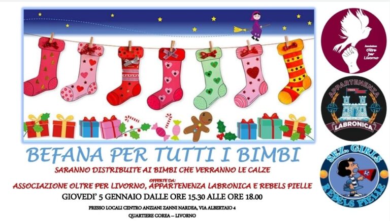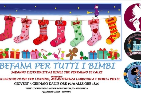 Giovedì 5 gennaio dalle 15,30 alle 18 al Centro Anziani Zanni Nardea in via Albertaio, 4 quartiere Corea si svolgerà l’iniziativa “Befana per tutti i bimbi”. Ai bambini presenti verranno distribuite calze offerte da associazione Oltre per Livorno, Appartenenza Labronica e Rebels Pielle.