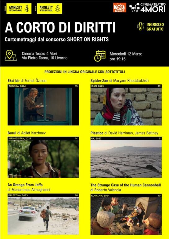 Mercoledì 12 marzo, alle ore 19.15, al Cinema Teatro 4 Mori, piazza Pietro Tacca, A Corto di Diritti, sei cortometraggi dal concorso Short on Rights, a cura di Amnesty International e Corto Dorico.