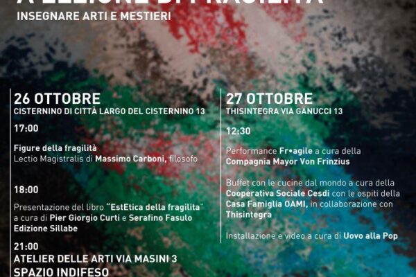 A lezione di fragilità parte sabato 26 ottobre alle ore 17 con la presentazione del libro EstEtica della Fragilità a cura di Pier Giorgio Curti e Serafino Fasulo – Edizione Sillabe e la Lectio magistralis del filosofo Massimo Carboni, per approdare alle 21 all’Atelier delle arti con la performance di danza contemporanea Spazio Indifeso all’interno della rassegna Racconti di altre danze che vedrà la partecipazione delle ospiti della Casa famiglia OAMI e si concluderà domenica 27 ottobre da Thisintegra con un buffet offerto dalle donne della Cooperativa Cesdi, le installazioni visive a cura di Uovo alla pop e la performance teatrale a cura della Compagnia Mayor Von Frinzius.