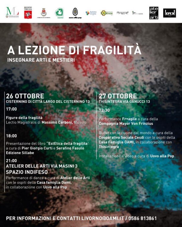 A lezione di fragilità – Insegnare arti e mestieri è un progetto a cura di Oami Livorno con il sostegno della Regione Toscana – Contributi in ambito sociale per soggetti del Terzo Settore e il Comune di Livorno e con la partecipazione di alcune realtà sociali e artistiche del territorio: Mayor Von Frinzius, Cooperativa Cesdi, Thisintegra, In Associazione, Autismo Livorno, Atelier delle arti e Uovo alla pop che hanno costruito “ad arte” un percorso di inclusione, scambio, conoscenza e interazione tra il mondo della disabilità, delle arti visive e performative e della cucina etnica allo scopo di creare buone pratiche per una migliore ed efficace convivenza all’interno del tessuto sociale e culturale cittadino.