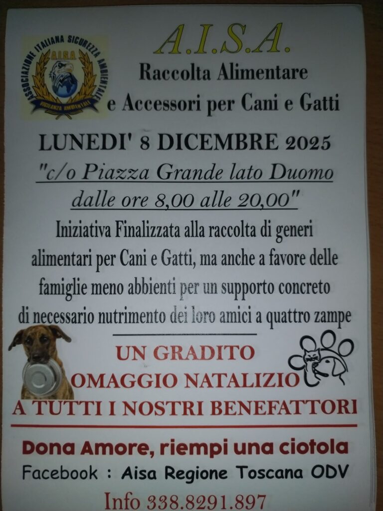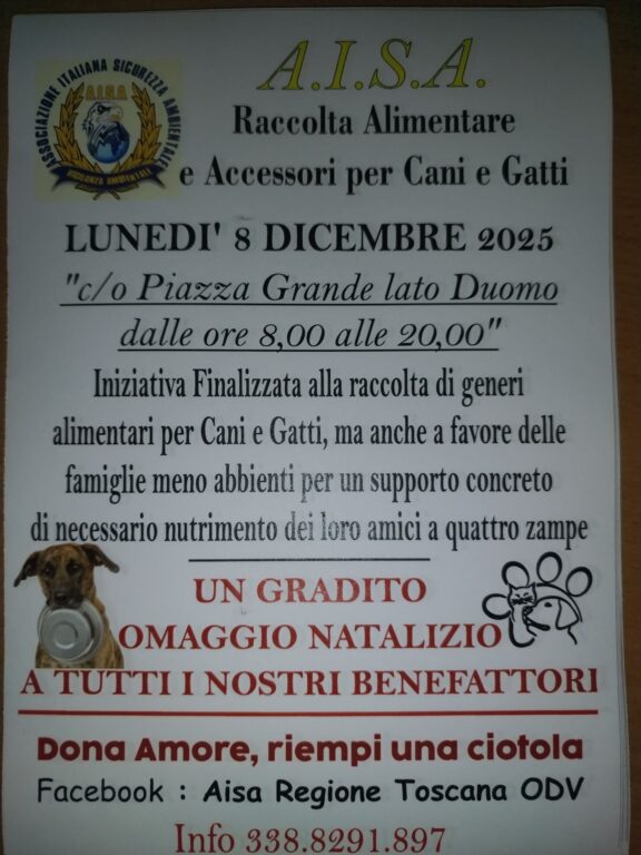 Lunedì 8 dicembre 2025 l’AISA – Associazione Italiana Sicurezza Ambientale, Regione Toscana ODV – promuove una grande raccolta alimentare e di accessori per cani e gatti nel cuore di Livorno. L’iniziativa si terrà in piazza Grande, lato Duomo, con orario continuato dalle 8 alle 20.