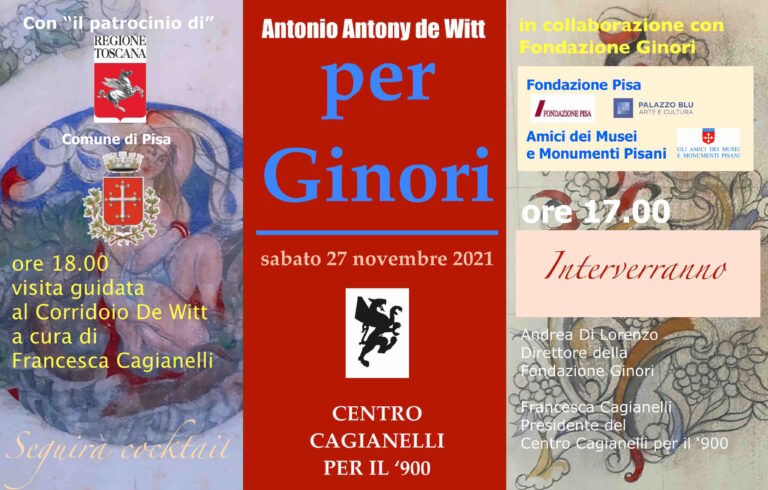 Sabato 27 novembre alle 17 nella sede del Centro Cagianelli per il ‘900 (Pisa, viale delle Cascine, n. 8, Sala dei Bucciotti), al via la prima fase del progetto scientifico “Antony de Witt per Ginori”, promosso dal Centro Cagianelli per il ‘900, in collaborazione con Fondazione Ginori, Fondazione Pisa e Fondazione Palazzo Blu, Amici dei Musei e Monumenti Pisani, con il Patrocinio di Regione Toscana e Comune di Pisa.