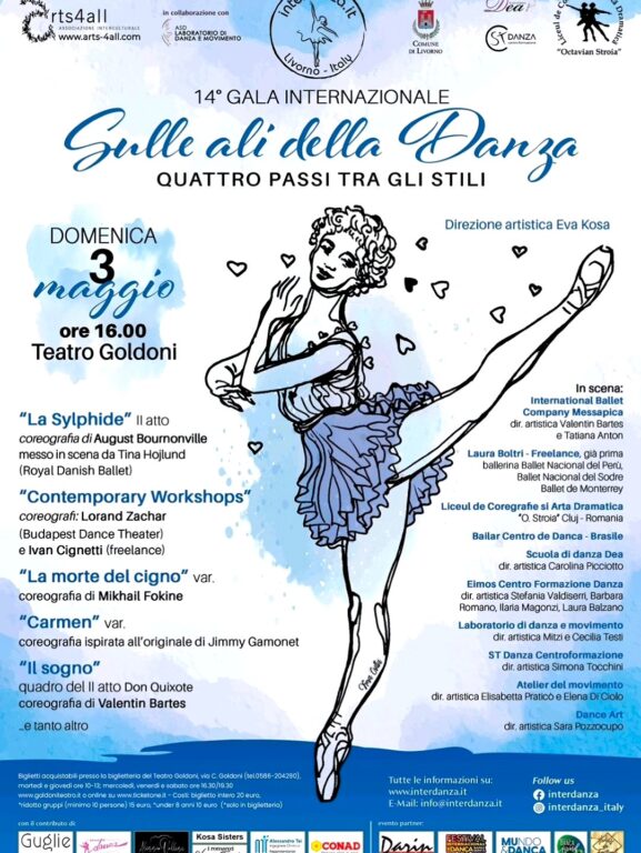 Domenica 3 maggio alle ore 16 il Teatro Goldoni di Livorno accoglierà uno degli appuntamenti più attesi della stagione coreutica del territorio: il Gala Internazionale di Danza “Sulle ali della danza” del progetto Interdanza, giunto alla XIV edizione e organizzato dall’associazione Arst4all, con la direzione artistica di Eva Kosa, in collaborazione con Laboratorio di Danza e Movimento, diretto da Cecilia Testi e Mitzi Testi.