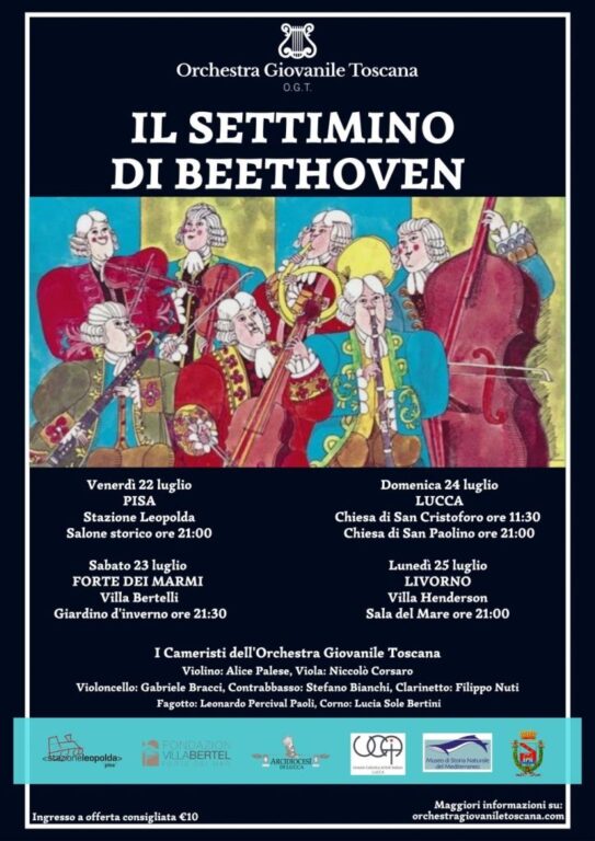 Si chiama “Settimino di Beethoven” ed è il progetto musicale dell’OGT Orchestra Giovanile Toscana che consiste in una piccola tournée toscana a fine luglio per salutare Alice Palese, spalla dell’Orchestra che volerà negli Stati Uniti, grazie alla vittoria di una prestigiosa borsa di studio presso la Park University di Kansas City. La Sala del Mare sarà la splendida cornice del Museo di Storia Naturale del Mediterraneo, dove lunedì 25 luglio alle 21, l’Orchestra Giovanile Toscana si esibirà allietando il pubblico sulle note del grande compositore tedesco Ludwig Van Beethoven (1770-1827).