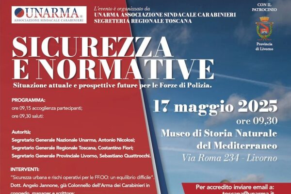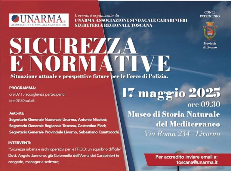 La Segreteria Regionale Toscana di UNARMA – Associazione Sindacale Carabinieri in sinergia con la Segreteria Provinciale di Livorno organizza un convegno dal titolo “Sicurezza e normative: situazione attuale e prospettive future per le Forze di Polizia”, con l’obiettivo di affrontare temi centrali per il comparto sicurezza: dalla normativa vigente alle ricadute operative e psicologiche per gli operatori delle Forze dell’Ordine.