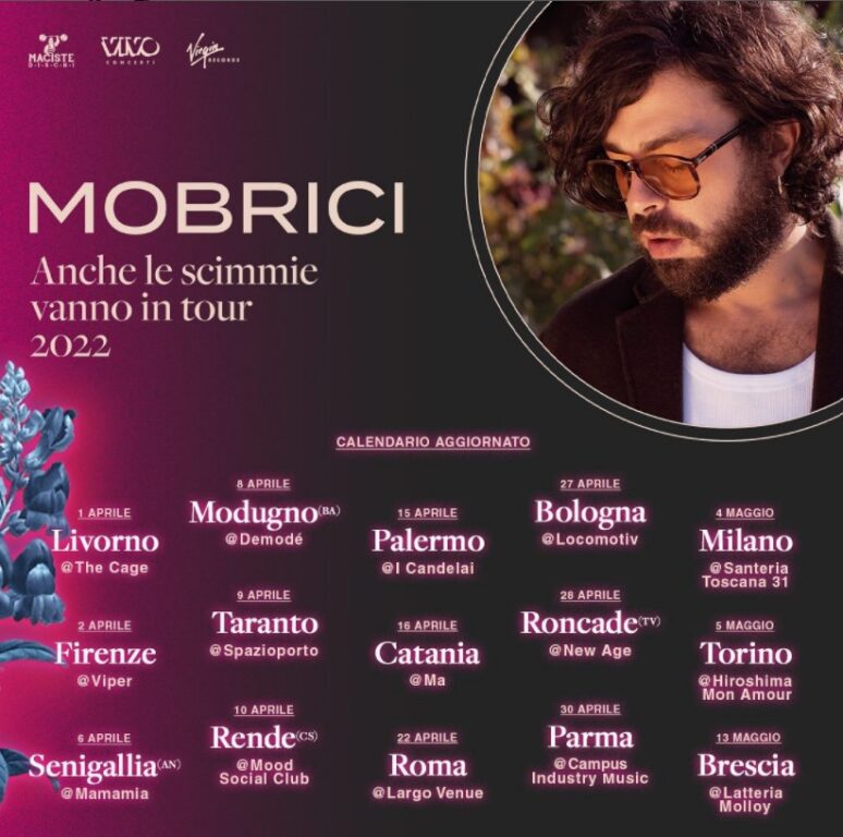 Il 1 aprile partirà da Livorno il primo tour da solista di Mobrici che si esibirà sul palco del The Cage. In questo tour porterà per la prima volta su un palco le canzoni del suo ultimo primo album “Anche le scimmie cadono dagli alberi“, nonché pezzi dei Canova, come lui stesso ha annunciato sui social.