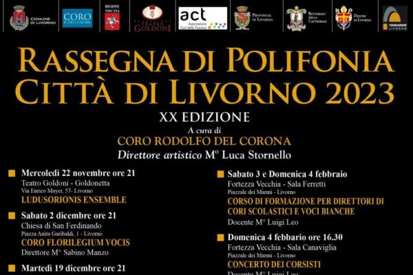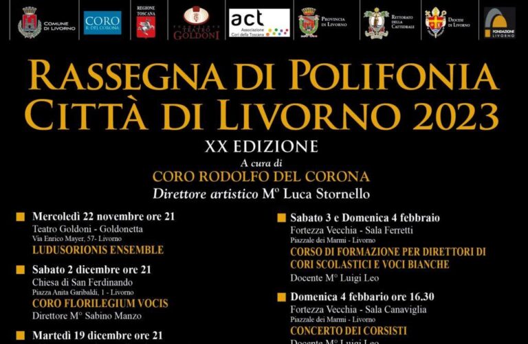 Al via la nuova edizione della Rassegna di Polifonia “Città di Livorno”, organizzata dall’associazione Coro “R. Del Corona” APS in compartecipazione con il Comune di Livorno e con la direzione artistica del M° Luca Stornello. Quest’anno si celebra il traguardo della ventesima edizione: un traguardo di non poco conto, segno di un impegno continuativo in favore della diffusione della cultura polifonica, premiato da un pubblico sempre crescente e dall’interesse di istituzioni pubbliche e private.