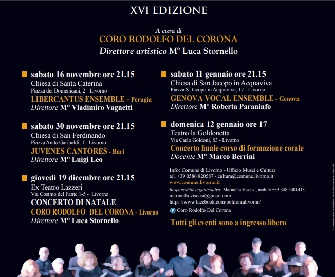 Ai nastri di partenza la sedicesima edizione della Rassegna di Polifonia “Città di Livorno”, organizzata dal Coro Rodolfo Del Corona con la compartecipazione del Comune di Livorno. La stagione di eventi polifonici, con la direzione artistica del maestro Luca Stornello, diviene ormai un appuntamento fisso nel panorama cittadino, ricevendo il riconoscimento di una lunga lista di enti, associazioni e soggetti privati.
