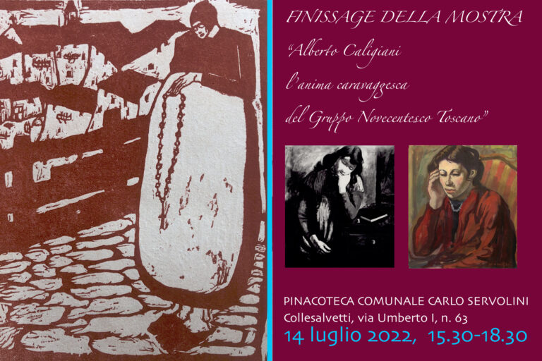 Si terrà giovedì 14 luglio 2022, a partire dalle 15.30, alla Pinacoteca Comunale Carlo Servolini (Collesalvetti, via Umberto I, n. 63, fino alle 18.30), il Finissage della mostra “Alberto Caligiani: l’anima caravaggesca del Gruppo Novecentesco Toscano”