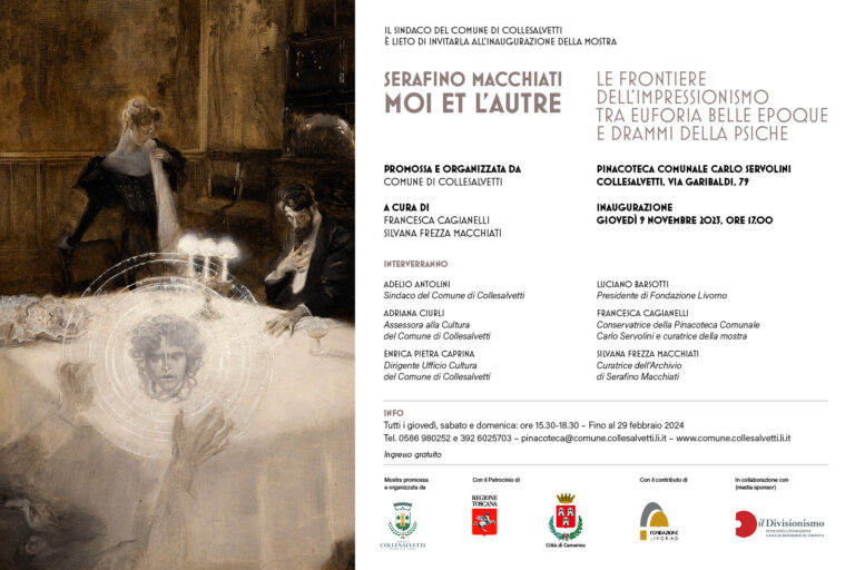 Si inaugura giovedì 9 novembre 2023, alle 17, alla Pinacoteca Comunale Carlo Servolini (Villa Carmignani, via Garibaldi, n. 77 – Collesalvetti), la mostra Serafino Macchiati: Moi et l’autre. Le frontiere dell’impressionismo tra euforia Belle Epoque e drammi della psiche, promossa e organizzata dal Comune di Collesalvetti, con il Patrocinio di Regione Toscana e, del Comune di Camerino, comune di nascita dell’artista; con il contributo di Fondazione Livorno e in collaborazione con Il Divisionismo – Pinacoteca Fondazione Cassa di Risparmio di Tortona / Media Sponsors; ideata e curata da Francesca Cagianelli e Silvana Frezza Macchiati.