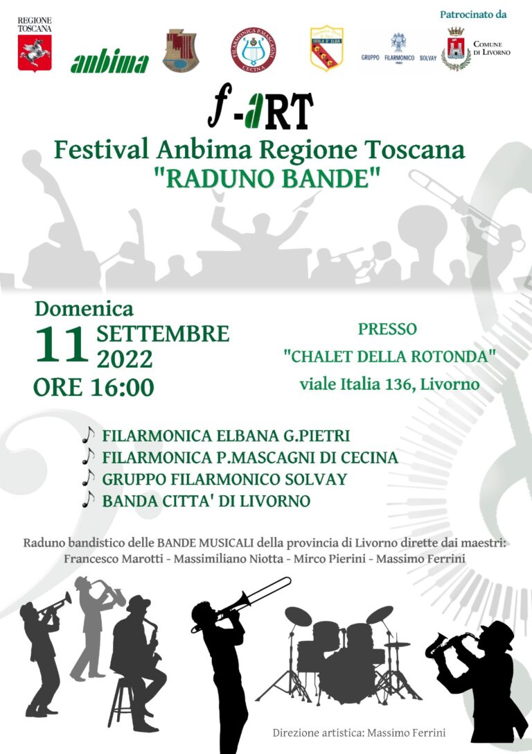 Domenica 11 settembre alle 16 all’interno della pineta Rotonda d’Ardenza si terrà il  “F-art Raduno Bande” con ingresso gratuito. Anbima (Associazione Nazionale Delle Bande Italiane Musicali Autonome) ha preparato un nuovo tipo di Festival Bandistico che in questa timida ripresa delle attività interesserà tutta la regione Toscana. Nasce il F – ART ossia il Festival – Anbima Regione Toscana ed interesserà un Comune di ogni provincia regionale. In ogni Comune si esibiranno 5 filarmoniche di quella stessa provincia in un’unica giornata, quindi come raduno bandistico. La seconda edizione si svolgerà nella città di Livorno il giorno 11 settembre 2022 coinvolgendo la Banda Città di Livorno ospitante ed invitando le filarmoniche di isola D’Elba, Cecina e Rosignano.