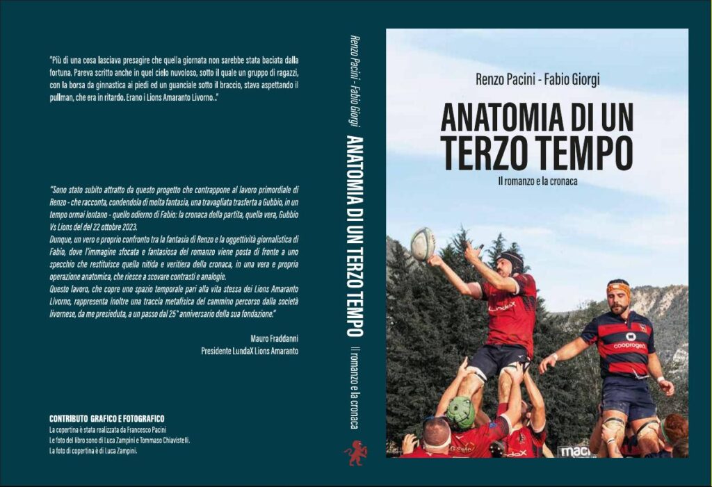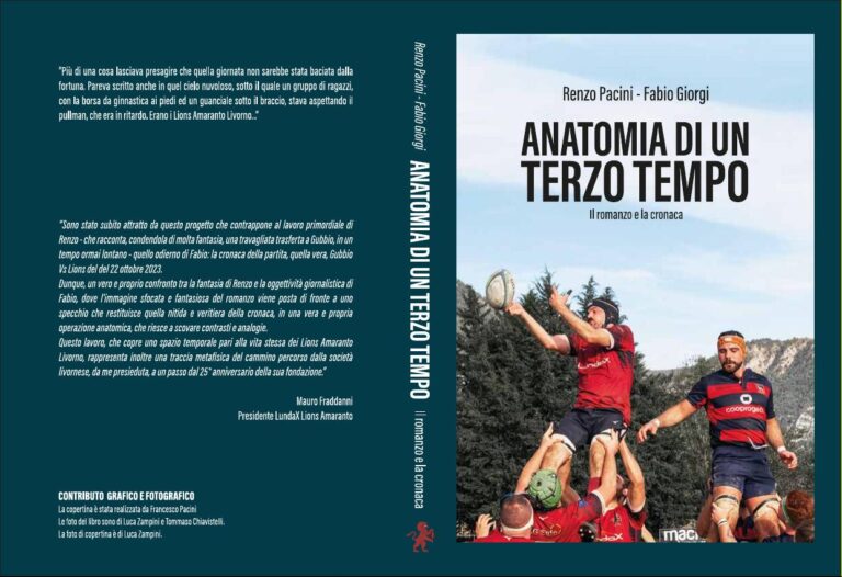 Il libro. Si tratta di un remake del noto romanzo di Pacini ‘Nel terzo tempo’ (2018), che si confronta con la cronaca particolareggiata della partita di B dello scorso 22 ottobre tra il Gubbio e la LundaX Lions Amaranto (quella vera) descritta dal giornalista sportivo Fabio Giorgi. Il libro è stato anche occasione per approfondire e far conoscere la storia del club, che sta per festeggiare i suoi primi 25 anni d’attività. L’ opera, a contenuto prettamente sportivo, ha voluto però far emergete gli aspetti etici e valoriali che caratterizzano il rugby, affidandoli a una storia di grande impatto emotivo, che vede al centro il percorso di riabilitazione di un pilone divenuto paraplegico per un infortunio sportivo, dal quale emerge la grande l’inclusività di questo sport e di chi lo pratica. Ne è prova il progetto ‘Pecore Nere’ che ha portato alla creazione della omonima squadra, composta da detenuti dell’istituto penitenziario de ‘Le Sughere’ di Livorno, un risultato reso possibile dal lavoro degli stessi Lions Amaranto e da tanti volontari, tra i quali l’indimenticato Manrico Soriani, al quale gli autori hanno dato il meritato spazio nella parte finale del libro.
