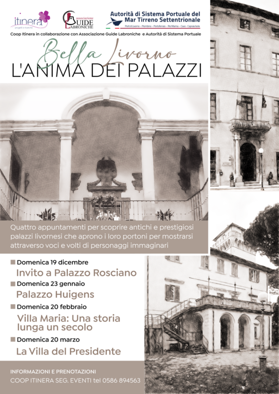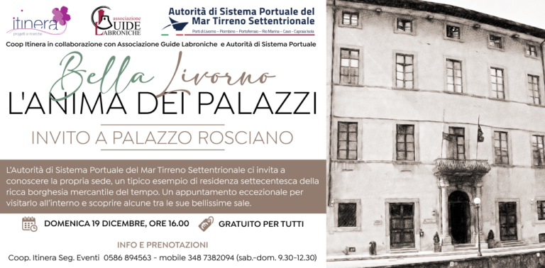 Domenica 19 dicembre, a Palazzo Rosciano, parte il primo appuntamento del programma l’Anima dei Palazzi, che prevede quattro incontri dedicati alla conoscenza dei luoghi più insoliti della nostra Bella Livorno. Quattro date da segnare sulla vostra agenda (in fondo all’articolo la locandina con le altre date) per venire a scoprire insieme a noi la storia, i segreti e le curiosità di antichi e prestigiosi palazzi livornesi che eccezionalmente aprono i loro portoni  per  mostrare la loro intima  identità attraverso  voci e volti di personaggi  immaginari. Grazie alla collaborazione con l’Autorità di Sistema Portuale del Mar Tirreno Settentrionale il calendario si apre con una visita guidata molto esclusiva, un tour all’interno della loro sede di Palazzo Rosciano, nel cuore del quartiere Venezia.