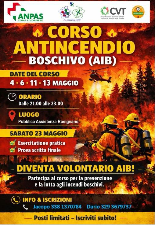 data-start=”362″ data-end=”644″>La Zona Livornese ANPAS, di cui fa parte la Pubblica Assistenza Collesalvetti, in collaborazione con i formatori del CVT (Coordinamento Volontariato Toscano), annuncia l’apertura delle iscrizioni al corso di formazione dedicato ai futuri operatori dell’Antincendio Boschivo.