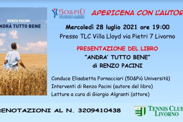 Metti una sera a Villa Lloyd: mercoledì 28 luglio alle 19. L'associazione 50&più, con la collaborazione del Tennis Club Livorno ha organizzato un'apericena con l'autore in occasione della presentazione del libro “Andrà tutto bene” di Renzo Pacini.