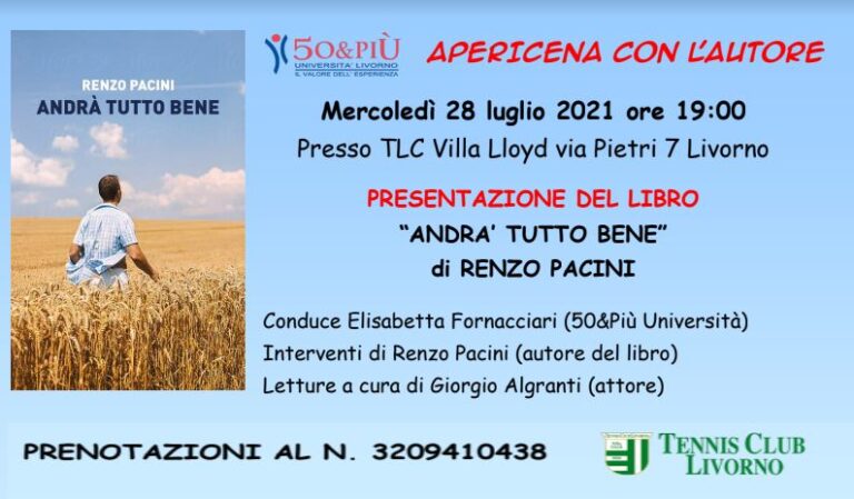 Metti una sera a Villa Lloyd: mercoledì 28 luglio alle 19. L’associazione 50&più, con la collaborazione del Tennis Club Livorno ha organizzato un’apericena con l’autore in occasione della presentazione del libro “Andrà tutto bene” di Renzo Pacini.