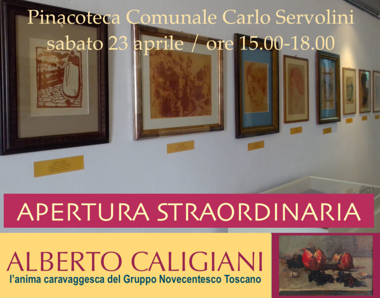 A seguito delle prenotazioni pervenute la Pinacoteca Comunale Carlo Servolini ha il piacere di annunciare la 1° Apertura Straordinaria in occasione della mostra “Alberto Caligiani: l’anima caravaggesca del Gruppo Novecentesco Toscano”