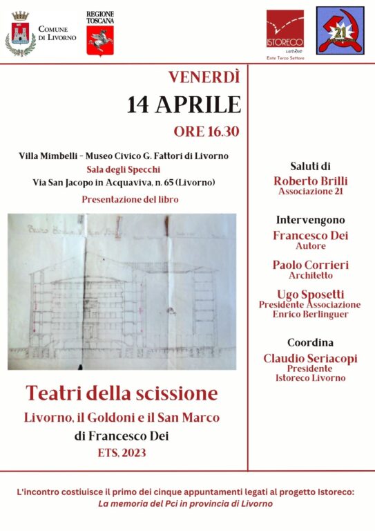 Primo appuntamento sulla storia del Pci: Dal Teatro Goldoni al Teatro San Marco dove cominciò la storia del PCd’I. L’incontro, in programma il 14 aprile alle 16,30 in Villa Mimbelli (Museo Civico Fattori) si concentra sulle vicende dei due teatri fondamentali per la storia politica del Novecento: il teatro Goldoni con l’assise del XVII Congresso del Partito socialista e il Congresso della minoranza comunista che, dopo la scissione, si riunì al Teatro San Marco per fondare il PCd’I. Un racconto analitico e documentato delle vicende che portarono alla costruzione e all’utilizzazione dei due teatri cittadini, luoghi deputati al ritrovo e ai loisirs, ma anche luoghi per eccellenza del dibattito politico e culturale del tempo.