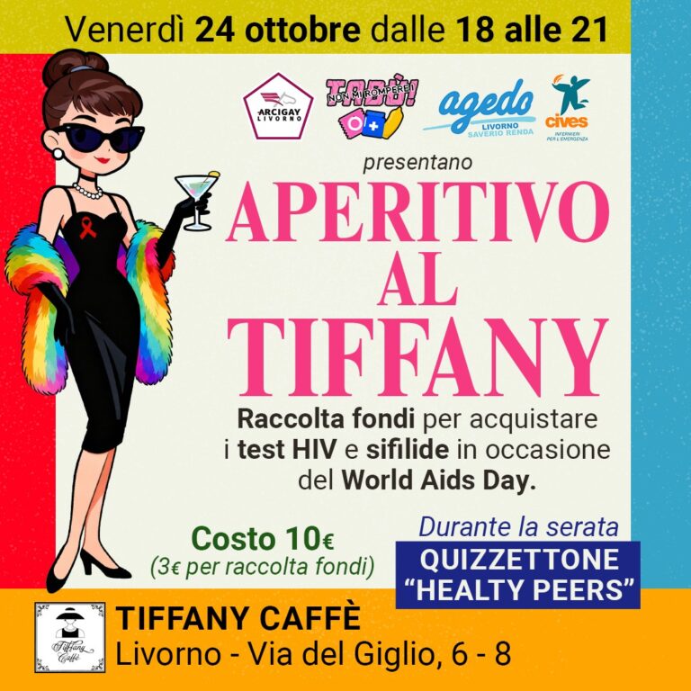 Venerdì 24 ottobre Arcigay Livorno, in collaborazione con le associazioni Agedo Livorno e Cives, organizza una serata di autofinanziamento per raccogliere fondi destinati all’acquisto di test hiv e sifilide in vista dell’evento di screening che si svolgerà, nell’ambito del progetto Testati! in occasione del World AIDS Day per sensibilizzare la cittadinanza sui temi delle infezioni sessualmente trasmesse (IST) e della salute. Durante la serata, sarà possibile partecipare al gioco Healthy Peers, un modo divertente per approfondire e informare sulla salute e il benessere sessuale. L’evento si svolgerà al Tiffany Caffè dalle 19 alle 21. Il costo dell’aperitivo sarà di 10 € di cui 3 € saranno destinati alle associazioni organizzatrici per l’acquisto dei test.
