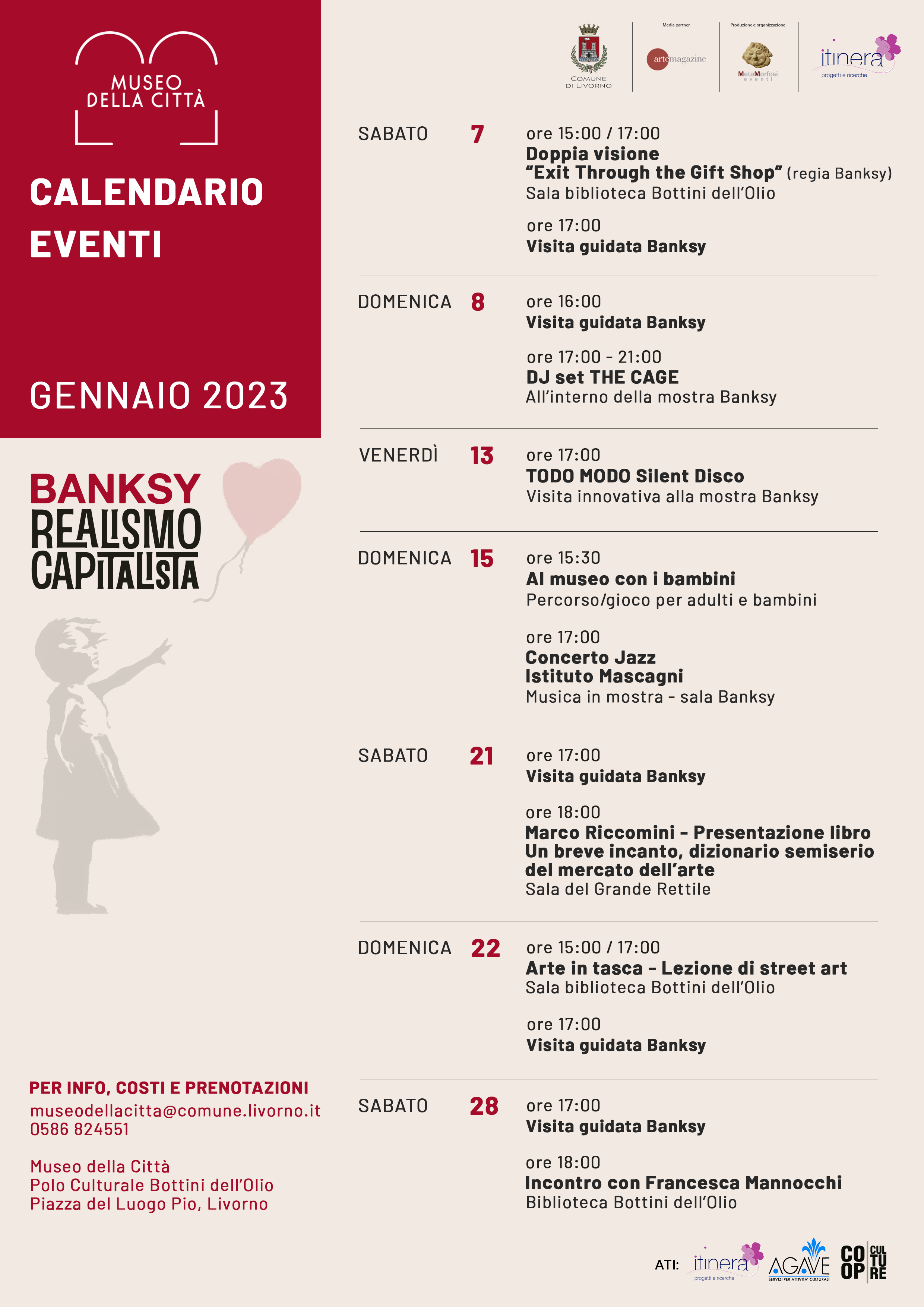 Un cartellone ricco di eventi collaterali accompagnerà, nei fine settimana di gennaio, la mostra “Banksy. Realismo Capitalista. An Unauthorized Exhibition”  in corso al Museo della Città (piazza del Luogo Pio) fino al 19 marzo: in programma film, musica, lezioni di street art, presentazioni di libri. E ogni sabato alle ore 17 è prevista una visita guidata alla mostra. Gli eventi sono organizzati dal Comune di Livorno e coordinati da Coop Itinera in collaborazione con Coop. Agave, CoopCulture, Biblioteca Labronica di Villa Maria – Centro di documentazione sulle arti dello spettacolo, Associazione The Cage. Per partecipare alle iniziative è necessario avere acquistato il biglietto della mostra.