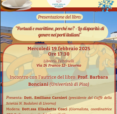 Il 19 febbraio alle 17.30 alla libreria Feltrinelli in via di Franco, 12 Il Caffè della Scienza Nicola Badaloni di Livorno presenta il libro di Barbara Bonciani dal titolo “Portuali e marittime, perché no? La disparità di genere nei porti italiani” (Franco Angeli editore). All’incontro con l’autrice, Prof.ssa Barbara Bonciani, interverranno il Dott. Emiliano Carnieri (presidente del Caffè della Scienza N. Badaloni di Livorno) e la Comandante di lungo corso Luciana Mirella Cambiaso. A moderare sarà la Dott.ssa Elisabetta Cosci (Giornalista, coordinatrice CPO Ordine nazionale dei giornalisti)
