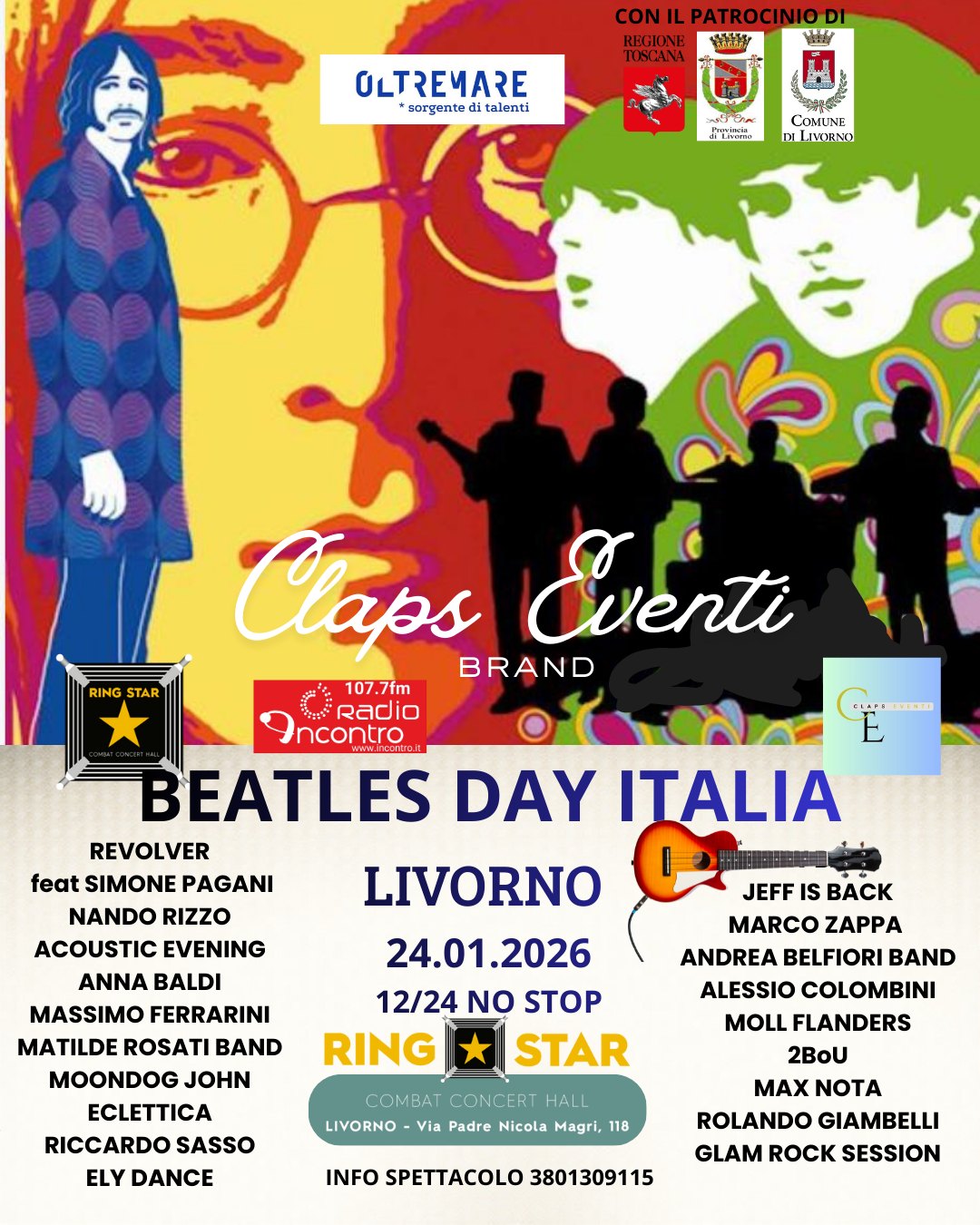 La musica senza tempo dei “Fab Four” continua a vivere e, ancora una volta, lo farà a Livorno grazie al Beatles Day Italia. Presentata questa mattina nella sala Post-Consiliare “Giuseppe Vitiello” di Palazzo Comunale, la giornata-evento organizzata da Claps Eventi avrà luogo sabato 24 gennaio, dalle 12 alla mezzanotte, all’interno del nuovo spazio culturale e musicale “Ring Star”, ideato presso il villaggio Oltremare in via Padre Magri 118. Una data non certo casuale, ma scelta per la sua vicinanza al 30 gennaio. Storico giorno in cui, nel 1969, la band sorprese Londra con un concerto sul tetto degli studi Apple Corps di Saville Row.