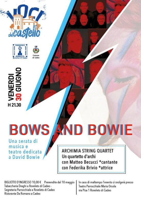 Un omaggio a David Bowie con una formula a dir poco magica. Un’alchimia composta dalla voce del livornese Matteo Becucci che si impasta alla perfezione con il quartetto d’archi Archimia String Quartet e si inserisce nella cornice creata dalla recitazione dell’artista milanese Federika Brivio. Uno spettacolo dalla durata di circa un’ora e venti minuti che prenderà vita il 5 giugno nella splendida location en plein air di Rocca di Riva del Garda per poi replicare il 30 giugno al Castello di Cadeo in provincia di Piacenza. Uno spettacolo unico nel suo genere “vestito” alla perfezione dalle mani esperte e dall’eccellenza tutta livornese di Chico De Maio, direttore di produzione e curatore di scenografia e luci, vero e proprio maestro per esperienza e perizia internazionale in questo campo.