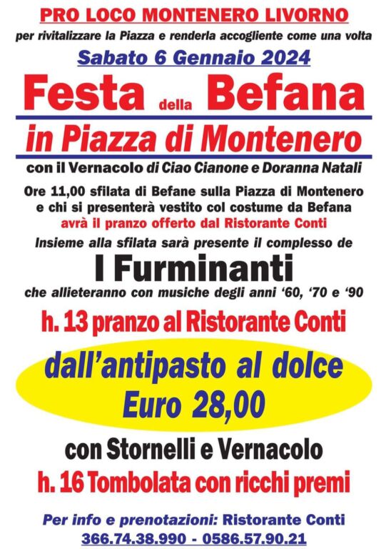 La Pro Loco di Montenero chiede più spazio e la splendida Piazza del Santuario grazie alla Festa della Befana si arricchirà, oltre che del concerto de I Furminanti anche del cabaret in vernacolo di Enrico Faggioni e Doranna Natali che proporranno a base di barzellette e stornello in vernacolo con tombolata finale e animazione, per una piazza in festa con si spera tante Befane travestite a cui l’organizzazione del ristorante da “Conti” offrirà in premio il pranzo con prezzo fissato a 28 euro dall’antipasto al dolce.