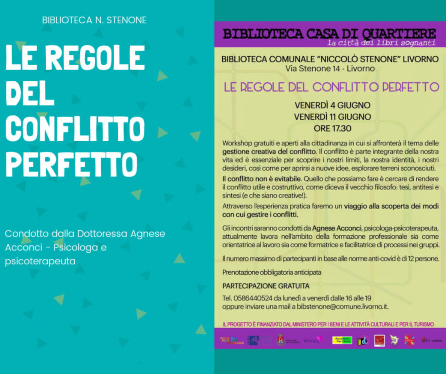 Proseguono gli appuntamenti nell’ambito del progetto La Città dei libri sognanti: Biblioteca Casa di Quartiere (foto tratta dalla pagina Fb Lacittadeilibrisognantilivornobibliotecastenone), promosso dal Comune di Livorno e finanziato dal Ministero per i beni e le attività culturali, che avviato nel 2018 ha consentito di organizzare diverse proposte educative e culturali nell’ambito dei quartieri nord della città. Prossima iniziativa due workshop gratuiti e aperti alla cittadinanza in cui si affronterà il tema delle gestione creativa del conflitto. Il conflitto è parte integrante della nostra vita ed è essenziale per scoprire i nostri limiti, la nostra identità, i nostri desideri, così come per aprirsi a nuove idee, esplorare terreni sconosciuti. Il conflitto non è evitabile. Quello che possiamo fare è cercare di rendere il conflitto utile e costruttivo, come diceva il vecchio filosofo: tesi, antitesi e sintesi (e che siano creative!). Attraverso l’esperienza pratica faremo un viaggio alla scoperta dei modi con cui gestire i conflitti.