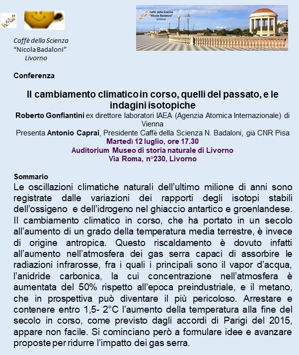Nuovo appuntamento con il Caffè della Scienza “Nicola Badaloni” di Livorno che si svolgerà all’Auditorium del Museo di Storia Naturale del Mediterraneo di Livorno in il 12 luglio a partire dalle 17.30. Il titolo della Conferenza è il seguente: Il cambiamento climatico in corso, quelli del passato, e le indagini isotopiche. Il relatore è il Prof. Roberto Gonfiantini (già direttore dei laboratori isotopici dell’Agenzia atomica Internazionale di Vienna). Presenta la conferenza il Prof. Antonio Caprai, Presidente del Caffè della Scienza (già CNR).