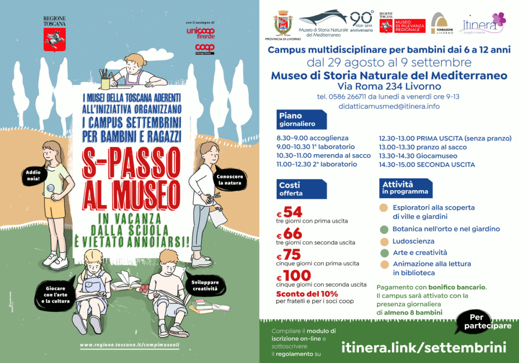 Le attività si rivolgono ai bambini dai 6 ai 12 anni e prevedono dal lunedì al venerdì percorsi didattici e laboratori di tipo scientifico e creativo. Iscrizioni online entro il 24 agosto su https://itinera.link/settembrini. INFO: tel. 0586/266711, tel. 0586/894563, mail [email protected]