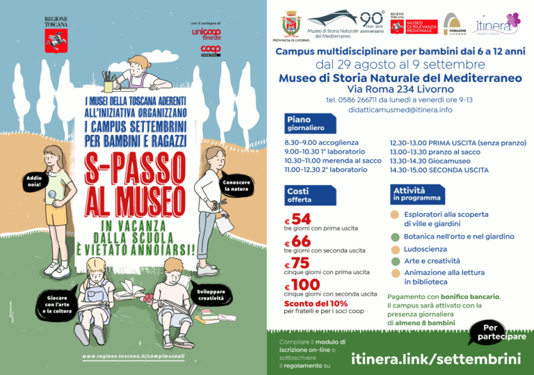 Il Museo di Storia Naturale del Mediterraneo, in collaborazione con la cooperativa Itinera, organizza anche questa estate il campus multidisciplinare a partire da lunedì 29 agosto al 9 settembre compresi. Le attività si rivolgono a bambini dai 6 ai 12 anni, si svolgeranno dal lunedì al venerdì e prevedono percorsi didattici e laboratori di tipo scientifico e creativo: ludo-scienza (paleontologia, archeologia, zoologia, botanica ecc.), creatività, arte-scienza, animazione alla lettura, ludoscienza, supporto compiti scolastici. I bambini saranno divisi in gruppi omogenei in base all’età, ad ognuno dei quali sarà dedicato uno specifico laboratorio ed uno spazio esterno per le numerose attività all’aperto. Saranno comunque previsti, soprattutto nel corso delle pause, momenti comuni che si svolgeranno esclusivamente all’aperto.