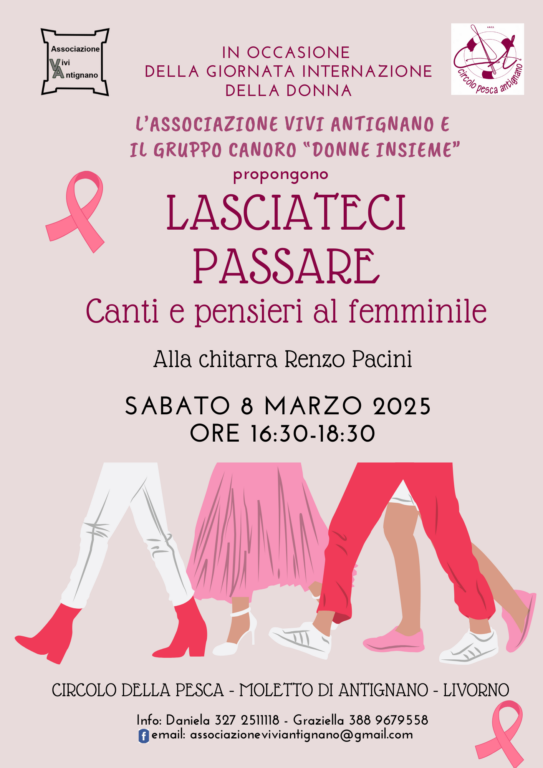 Pomeriggio di canti e riflessioni quello proposto dall’Associazione Vivi Antignano per sabato 8 marzo dalle 16,30 in poi in collaborazione con il Circolo della Pesca
