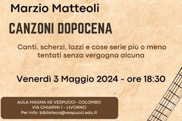 Per i Pomeriggi della Biblioteca dell’Istituto Vespucci-Colombo, in collaborazione con Erasmo Libri, venerdì 3 maggio, alle ore 18.30, nell’Aula Magna Istituto Vespucci-Colombo, via Chiarini, 1, appuntamento con Marzio Matteoli con lo spettacolo CANZONI DOPOCENA, che per ironia della sorte si svolgerà avanti cena. Saranno toccati vari temi cari alla tradizione popolare, toscana e non solo, ben espressi in canti, scherzi, lazzi e cose serie più o meno tentati senza vergogna alcuna.